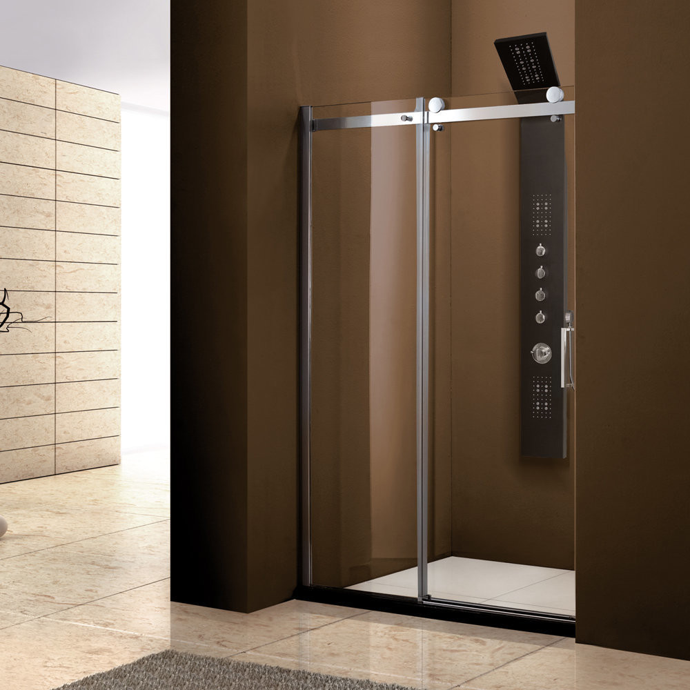 Sprchové dvere s jednými zásuvnými dverami, s otvoreným systémom pohybu kolies po vonkajšej strane kovovej konzoly a luxusným hranatým prevedením úchytiek na dverách. viac informácií