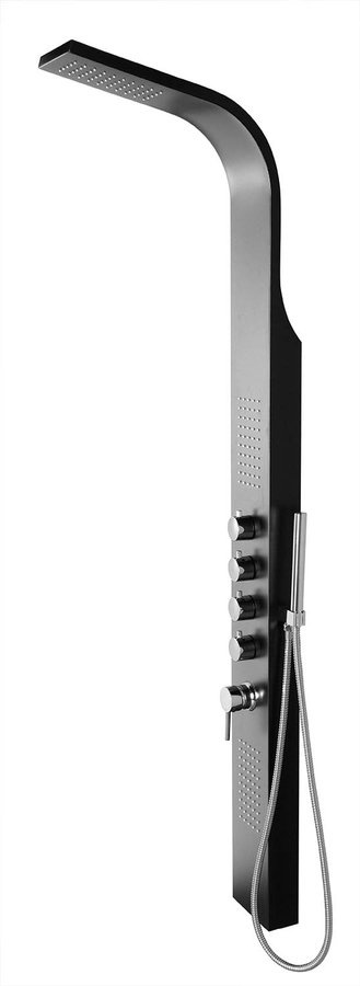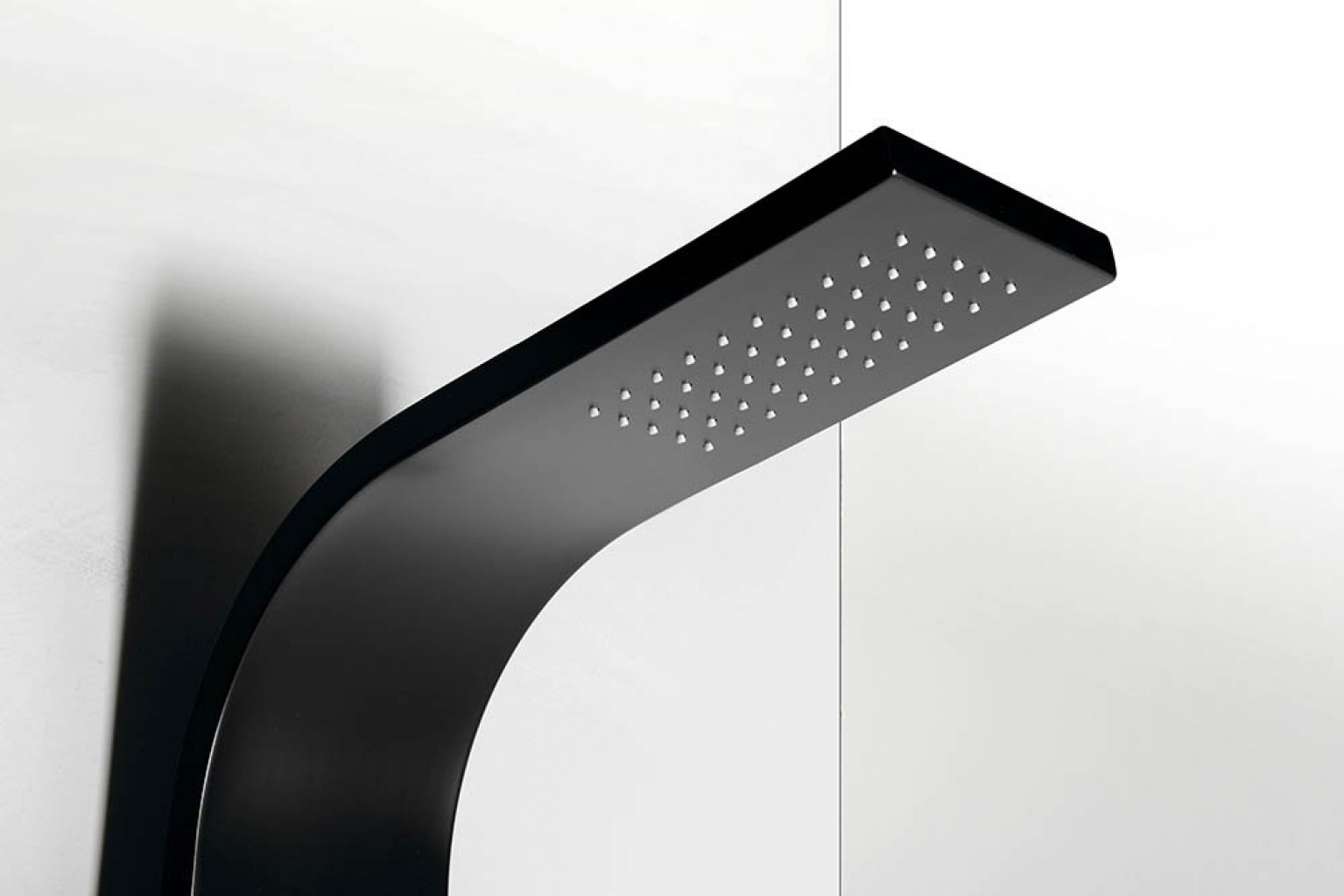 Sprchový kút v modernej kúpeľni dotvára elegantný sprchový panel, ktorý oproti klasickej batérii ponúka výber prúdu vody nielen z ručnej sprchy, ale iz hlavovej sprchy az bočných spŕšok. Sprchový hydromasážny panel MESA je vyrobený z čierno lakovaného hliníka. V jeho tele je zabudovaná páková batéria vrátane ventilov pre voľbu režimu sprchovanie. Panel je určený pre montáž na rovnú stenu. Hlavová sprcha dokáže priamo nad vašou hlavou spustiť dažďovú simuláciu. Očistu potom dokončíte praktickú ručnou sprchou, ktorá je šikovne prichytená z boku.